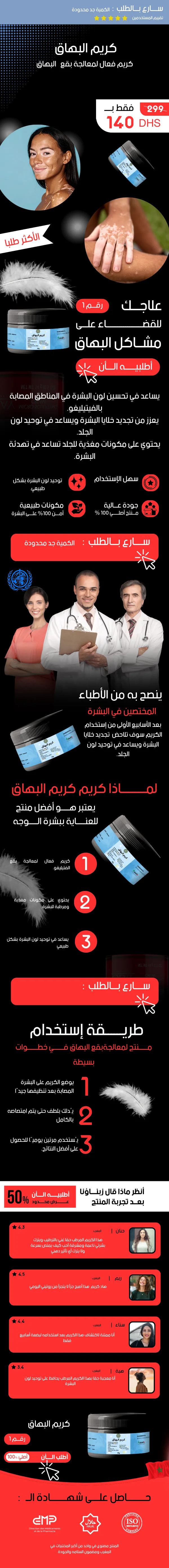 وصف كريم العناية بالبشرة المتصبغة (البهاق) كريم متخصص مصمم لدعم العناية بالبشرة المتصبغة وتقليل تفاوت اللون. يحتوي على تركيبة غنية بالمكونات المغذية التي تساعد في ترطيب البشرة وتعزيز توحيد لونها. يعمل على تهدئة التهيج، تغذية الجلد، وتحفيز مظهر أكثر توازنًا وإشراقًا. يساعد في تحسين مظهر التصبغات وتعزيز تجانس اللون يحافظ على ترطيب البشرة ويمنع الجفاف الذي قد يفاقم التفاوت اللوني يحتوي على مستخلصات طبيعية تساهم في تهدئة البشرة وتعزيز مرونتها